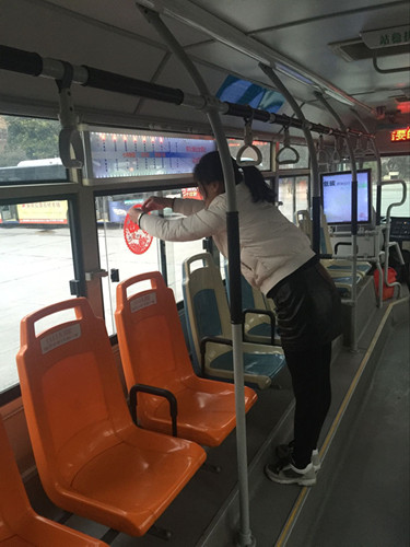 12月30日,是2016年的最后一個(gè)工作日,也臨近春節。為了烘托節日的氣氛,高新公交的工作員工利用下班時(shí)間來(lái)到主要站房,依次在每條線(xiàn)路每輛公交車(chē)車(chē)廂內、車(chē)窗等處貼出賀歲主題的紅色剪紙窗花,不但車(chē)廂里顯得格外喜慶,此舉也使得濃濃的年味兒流動(dòng)在合肥街頭。