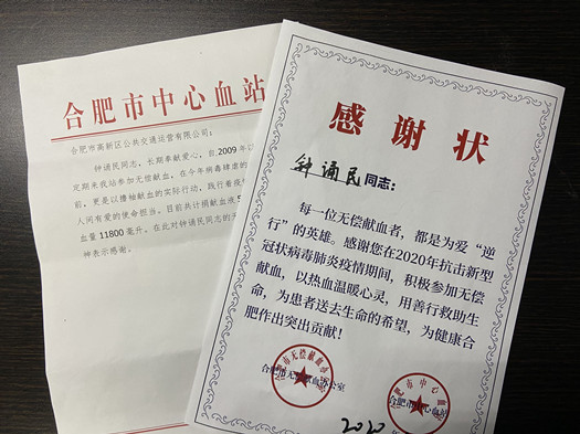 10月15日,高新公交收到一封特殊的信件,是來(lái)自合肥市中心血站的表?yè)P信,信中特別感謝658駕駛員鐘誦民同志在疫情期間積極參加無(wú)償獻血,為患者送去生命的希望,為健康合肥做出突出貢獻。