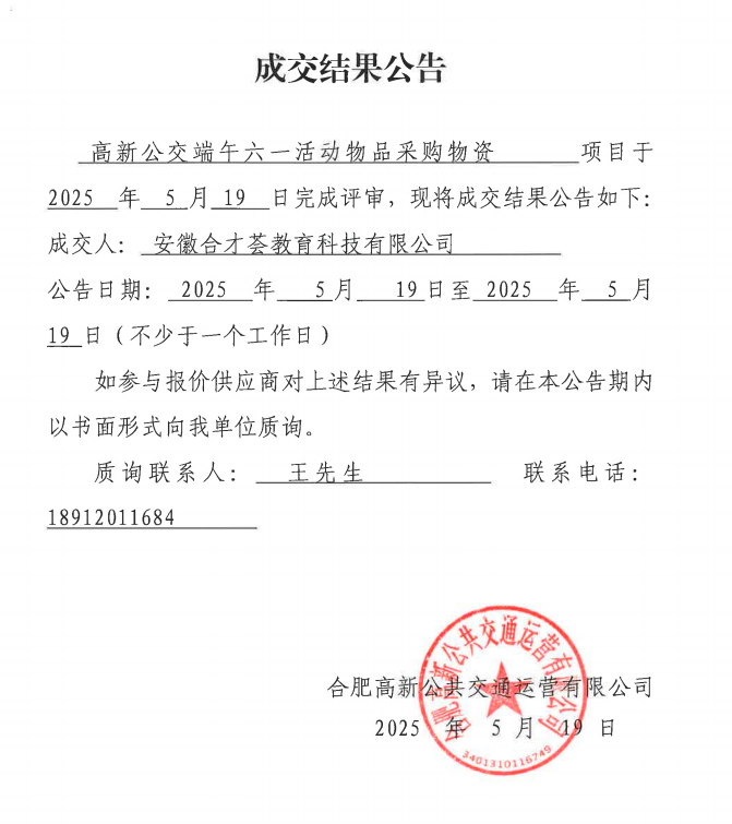 高新公交端午六一活動(dòng)物品采購項目成交結果公告