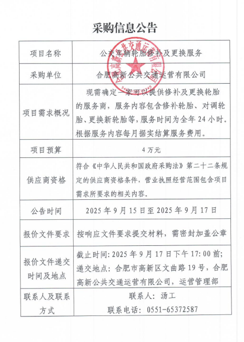 高新公交輪胎修補及更換服務(wù)采購信息公告