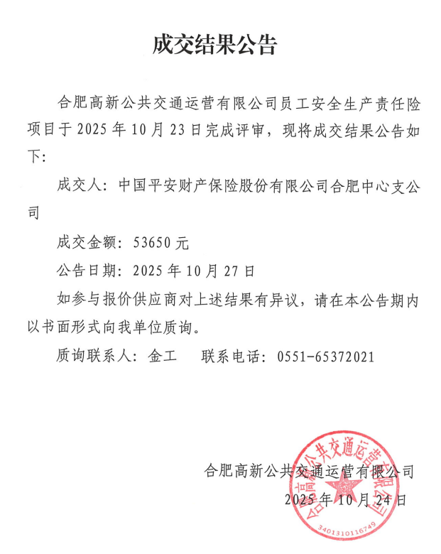 合肥高新公共交通運營(yíng)有限公司員工安全生產(chǎn)責任險項目成交結果公告